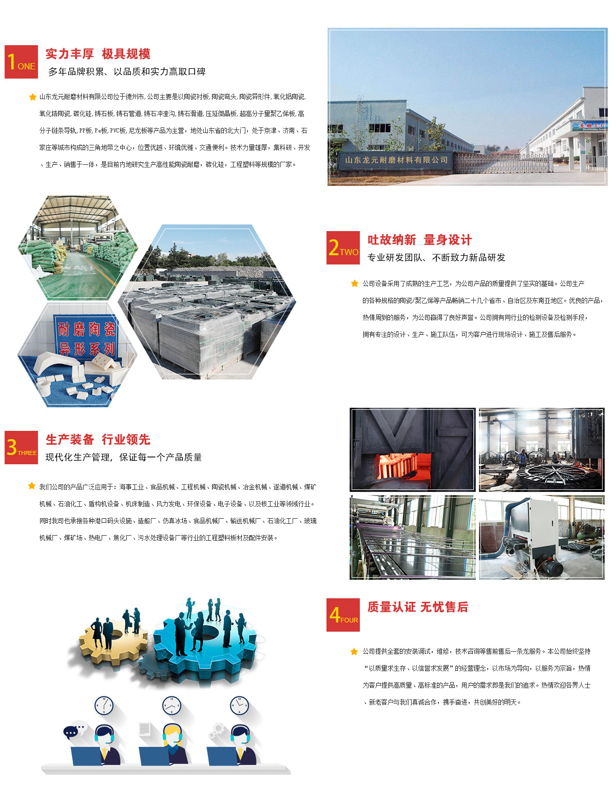 山東龍元耐磨材料有限公司位于德州市,公司主要是以鑄石板、氧化鋁陶瓷、三合一陶瓷復合襯板、陶瓷復合板、碳化硅、壓延微晶板、鑄石沖渣溝、氧化鋁陶瓷管道、氧化鋁陶瓷彎頭、三合一復合陶瓷板、鑄石管道、鑄石彎頭、氧化鋁陶瓷片、超高分子量聚乙烯板、三合一復合陶瓷板等產(chǎn)品為主營,地處山東省的北大門,處于京津、濟南、石家莊等城市構(gòu)成的三角地帶之中心,位置優(yōu)越、環(huán)境優(yōu)雅、交通便利。技術(shù)力量雄厚,集科研、開發(fā)、生產(chǎn)、銷售于一體,是目前內(nèi)地研究生產(chǎn)高性能陶瓷耐磨,碳化硅,工程塑料等規(guī)模大的廠家之一。公司設(shè)備采用了成熟的生產(chǎn)工藝,為公司產(chǎn)品的質(zhì)量提供了堅實的基礎(chǔ)。